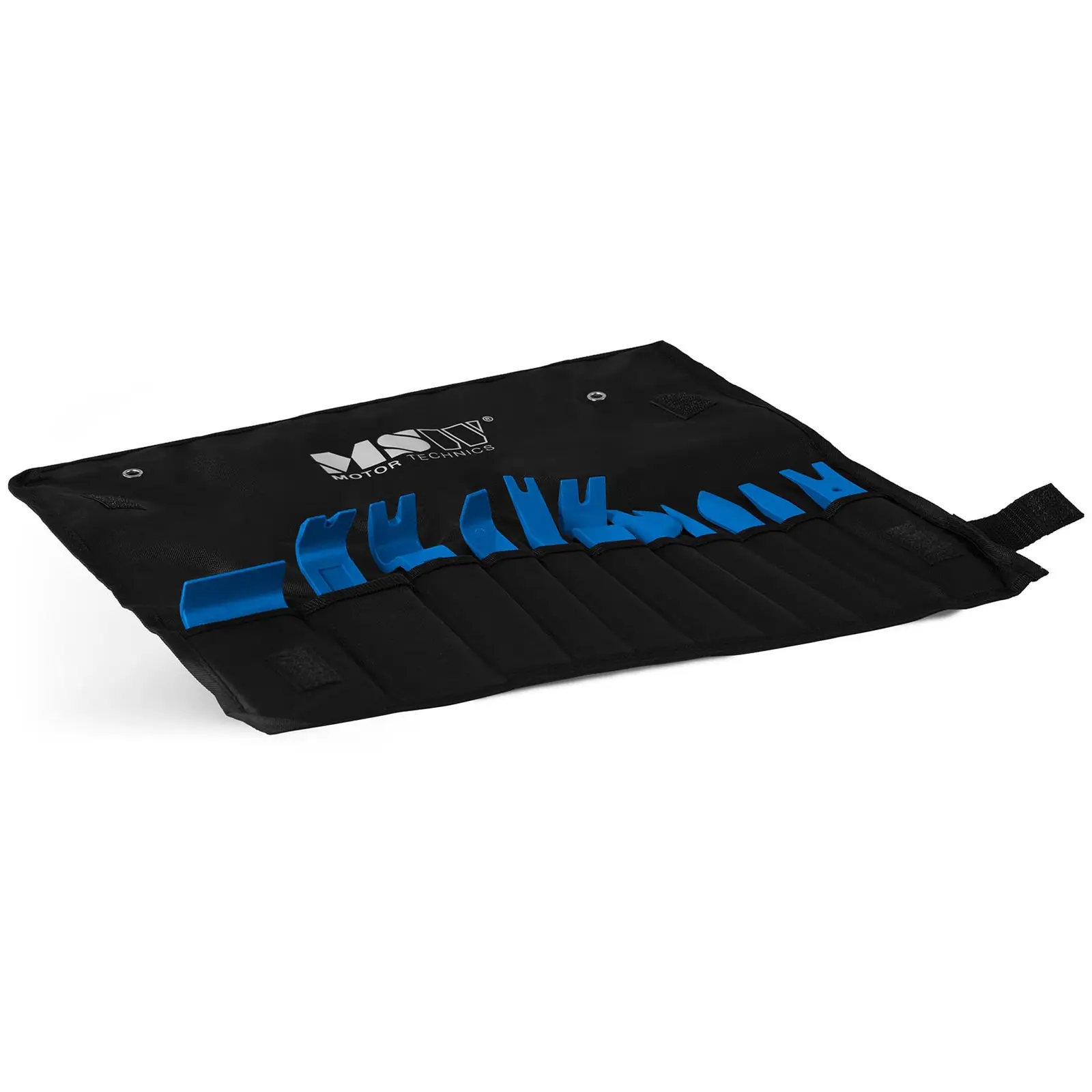 Haluatko poistaa taustapeilin autostasi, mutta se vain ei onnistu? Silloin sinulta puuttu vielä se oikea työkalu! MSW: n 11-osainen muovinen kiilasarja MSW-CA-109 on ihanteellinen työkalusarja monenlaisten verhoilujen, tiivisteiden, pidikkeiden, lisäosien ja listojen varovaiseen poistamiseen ja asennukseen ajoneuvon sisä- ja ulkopuolella. Yksitoista hyödyllistä pientä avustajaa, joita ilman ei yhdenkään ammattilaisen tulisi töitään hoitaa! Saatavilla on laaja valikoima eri muotoja, pituuksia ja päitä, jotka sopivat suurimmalle osalle autoista. Irrotustyökalujen rakenteen ansiosta 16 – 21 cm kokoisia vipuja voidaan käyttää myös vaikeasti saavutettavissa olevissa paikoissa: onpa kysessä sitten peilit, ovipaneelit, kojelaudat, kumitiivisteet, koristelistat tai ajovalot. Vankat asennusvivut tarjoavat kuitenkin myös arvokasta apua veneillä, lentokoneissa tai talossa työskennellessäsi. Työkalusarja on valmistettu nailonvahvisteisesta muovista vaurioiden ja naarmujen estämiseksi. Melko pehmeästä materiaalista huolimatta se vakuuttaa vakaudellaan ja kestävyydellään. Kaikki yksitoista osaa on lajiteltu siististi ja selkeästi kätevään laukkuun, jonka voit sijoittaa mihin tahansa käytön jälkeen tai ottaa helposti mukaasi asiakkaiden luo.