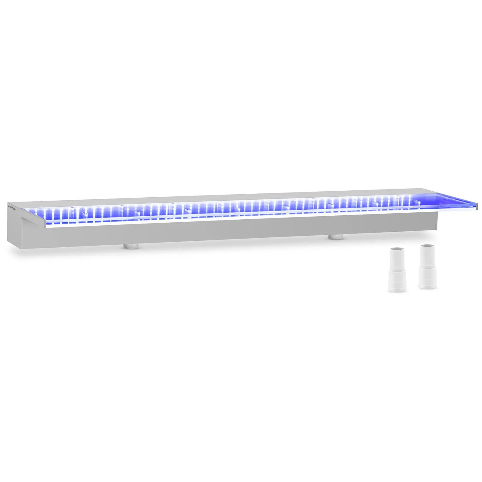 Himmeä valaistus ja lempeä veden liplatus: Uniprodon vesiputoussuihkulla luot miellyttävän tunnelman. Viihtyisä roiskuvan veden ääni syntyy, kun vesi virtaa tasaisesti mitoiltaan 90 cm:n kokoisesta ylivuodosta. Samalla virtaa säästävä LED-valaistus saa aikaan tyylikkäitä visuaalisia kohokohtia. Veden ylivuotosuutin muodostaa vesiputouksen alkupisteen. Kun allas, johon suihkulähde on kiinnitetty, täyttyy vedellä, se valuu alas reunan yli kuin vesiputous. Virtaavan veden liike ja ääni tarjoavat takuuvarmaa rentoutumista. Integroitujen sinisten valodiodien ansiosta saat valon suorastaan tanssimaan. Suihkulähteen vesielementti toimii taloudellisella 24 W:n teholla. Sen valaistus on suojattu roiskevedeltä joka suunnasta suojausluokan IP44 ansiosta. Haluatko tehdä vieraisiisi vaikutuksen tunnelmallisella vastaanottoaulalla? Tällä vesisuihkulla lisäät sisustuskonseptiisi oikean katseenvangitsijan. Vesielementti puutarhaan tai altaisiin on helppo koota ja asentaa niin seinään kuin muuraukseen. Pehmeän valon avulla luot viihtyisän tunnelman pienimpiinkin tiloihin. Vesisuihku on valmistettu tukevasta ja korroosionkestävästä akryylistä. Tämä suojaa sitä suola- tai klooriveden aiheuttamilta vaurioilta. Materiaali on vähän huoltoa vaativaa ja tekee vaikutuksen pitkällä käyttöiällään. Upea vesielementti puutarhaan, terassille tai uima-altaaseen! Tuotenumero – pituus: virtausnopeus10250616 – 120 cm: 20 000 l/h10250617 – 30 cm: 5 000 l/h10250618 – 30 cm: 5 000 l/h10250619 – 30 cm: 5 000 l/h10250620 – 45 cm: 7 500 l/h10250621 – 60 cm: 10 000 l/h10250622 – 60 cm: 10 000 l/h10250623 – 60 cm: 10 000 l/h10250624 – 90 cm: 15 000 l/h10250625 – 90 cm: 15 000 l/h10250626 – 90 cm: 15 000 l/h10250627 – 40 cm: 7 500 l/h10250628 – 30 cm: 5 000 l/h10250629 – 30 cm: 5 000 l/h10250630 – 30 cm: 5 000 l/h