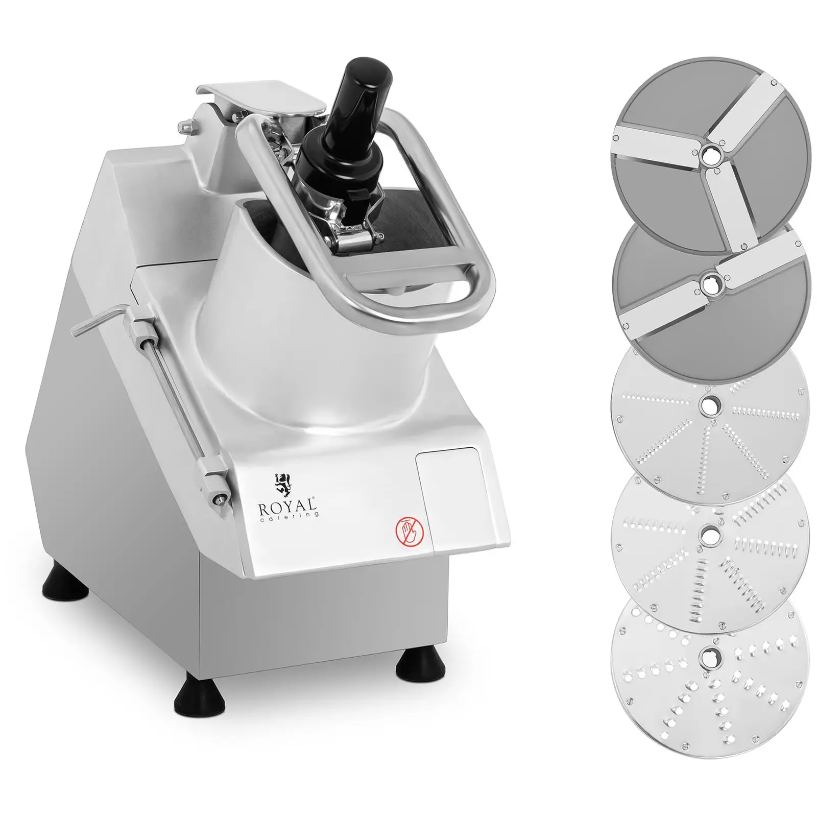 Royal Cateringin laadukkaisiin keittiövälineisiin lukeutuva sähköinen vihannesleikkuri RCGS-750 vakuuttaa korroosionkestävillä materiaaleillaan, on helppo puhdistaa ja on erityisen pitkäikäinen. Laite suunniteltiin erityisesti ammattikäyttöön ravintoloissa, suurkeittiössä ja pikaruokaloissa. Nopeuta ravintolayrityksesi työvaiheita tällä tehokkaalla monitoimileikkurilla! Porkkanaa, sipulia tai selleriä lukuunottamatta vihannesleikkuri leikkaa myös erilaisia hedelmiä ja jopa pehmeää juustoa. Intuitiivisesti käytettävä kone toimii ainoastaan kahdella kytkimellä – päälle ja pois päältä -kytkimillä. Moottori takaa erinomaisella 750 watin tehollaan leikkuuterien jopa 280 r/min olevan nopeuden. 205 mm halkaisijan ansiosta leikkaat ja raastat suuren määrä hedelmiä ja vihanneksia lyhyessä ajassa. Erityisen kätevää: sähköisessä vihannesleikkurissa on syöttöaukko pitkulaisille vihanneksille ja aukko normaalin muotoisille lajikkeille. Muovisen syöttötulpan avulla voit työntää jokaisen elintarvikkeen riskittömästi laitteeseen täydellistä työstöä varten. Kätesi ovat suojassa teriltä. Viisi mukana toimitettavaa, vankkaa ruostumatonta terästä olevaa terää, joista kolme on raasteteriä (3 / 4,5 / 7 mm) ja kaksi leikkuuteriä (2 / 4 mm), voidaan asettaa leikkuriin vain muutamassa käden käänteessä ja niiden puhdistus sujuu helposti. Terät on valmistettu kotelon tapaan kiillotetusta, anodisoidusta alumiinista, joten ne ovat elintarviketurvallisia ja täyttävät kaikki tiukimmatkin kansainväliset hygieniavaatimukset. Täten vihannesleikkurin ei tulisi puuttua yhdestäkään ravintolasta, suurkeittiöstä tai pitopalveluyrityksestä. Myös laitteen käyttöturvallisuus on taattu asianmukaisesti: kotelon alla sijaitsevat tuuletusaukot estävät moottorin ylikuumenemisen. Neljä massiivista kumitassua vaimentavat tärinöitä, takaavat laitteen vakauden sekä ehkäisevät työalustan naarmuuntumisen.