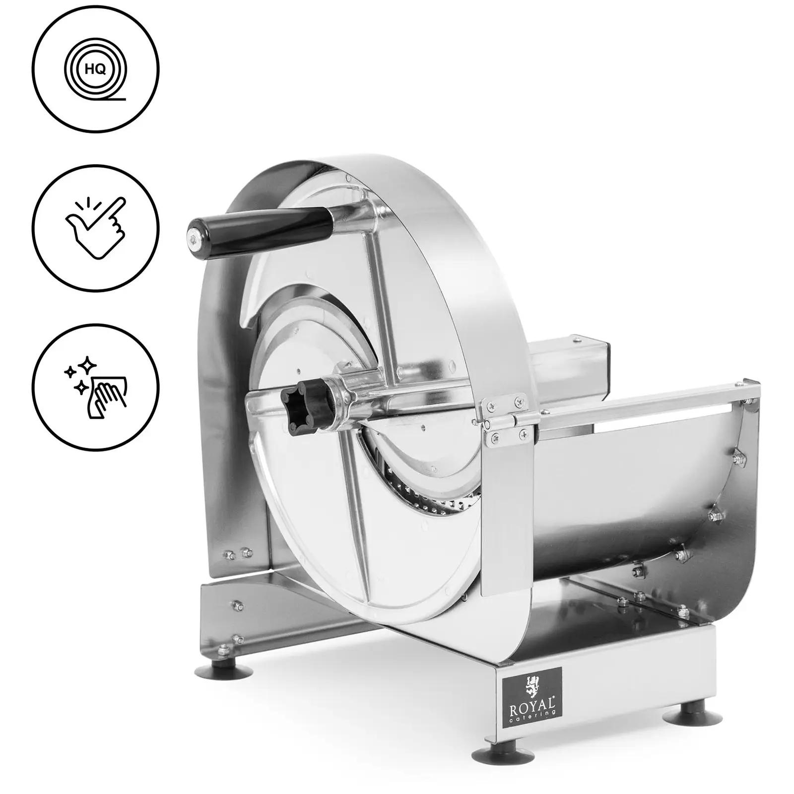 Tarjoatko tuoreita salaatteja ja vitamiinipitoisia vihanneksia ravintolassasi, bistrossasi tai kodin ulkopuolella? Royal Catering:n kestävällä vihannesleikkurilla olet päässyt asiaan, sillä laite, jossa on tasaisesti pyörivä kampi, leikkaa vihannekset nopeasti ja helposti. Voit ruuvata manuaalisen vihannesleikkurin työtasoon kiinni muutamassa vaiheessa. Toimitukseen sisältyy sopiva kiinnike. Manuaalisen käytön ansiosta voit helposti pilkkoa hedelmiä ja vihanneksia ilman virtaliitäntää – ihanteellinen mihin tahansa keittiöön, ulkotorille, ruoka-autoihin tai catering-telttaan. Vihannessilppuri toimii hyvin yksinkertaisesti: aseta ainekset laitteen takana olevaan suppiloon. Puristin painaa sitten leikattavan materiaalin leikkuulaikkaa vasten. Tartu sitten vain kiinni kampeen ja viipaloi vihannekset. Suppilossa on kansi, joka estää ainesten putoamisen käännettäessä. Voit asettaa leikkauspaksuuden yksitellen {{lcutting_thickness_197_lämpötila}} mm alkaen. Ohuet kurkku- tai paprikaviipaleet paksumpina siivuina valmistuvat nopeasti ja laite leikkaa täydellisesti myös kovat vihannekset, kuten porkkanat tai kyssäkaalin. Kammella varustettu vihannesleikkuri on erittäin kevyt ja helppo kuljettaa. Se on valmistettu helposti hoidettavasta ruostumattomasta teräksestä. Irrota vain leikkuri pidikkeestä puhdistamista varten.
