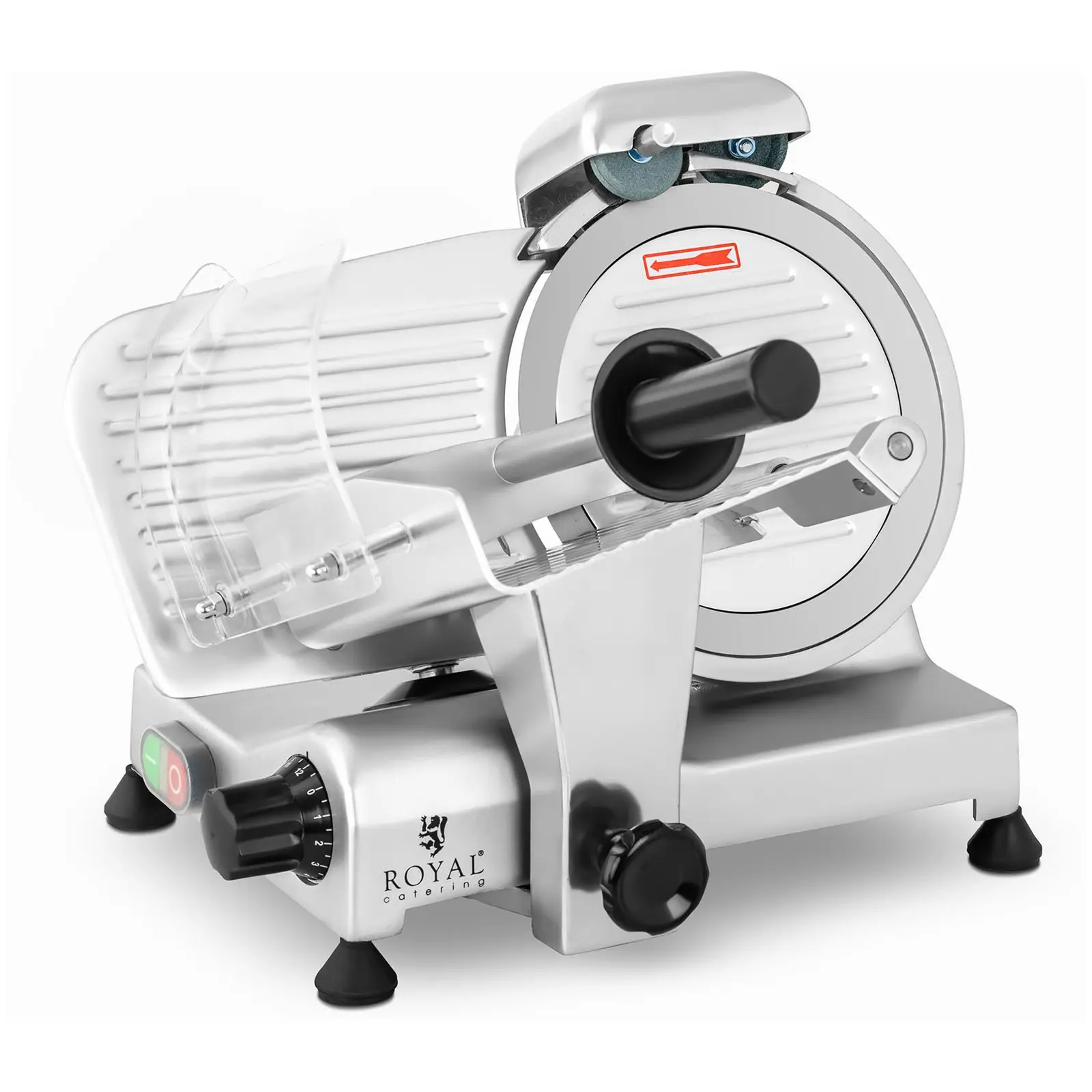 Makkaraa, juustoa tai luutonta lihaa – ei ole mitään, mitä Royal Cateringin ravintolalaitteista löytyvä laadukas siivutuskone RCMS-220MM ei leikkaisi millimetrintarkoiksi siivuiksi. Anodisoitu ja kiillotettu alumiini tekee viipalointikoneesta korroosionkestävän, helposti puhdistettavan ja kansainvälisten hygieniastandardien mukaisen. Tämä laite on ihanteellinen elintarvikemyymälöihin, lihatiskeille, ravintoloihin, hotelleihin tai laatua arvostaville käyttäjille kotikeittiöön. Suortituskykyinen 280 W:n sähkömoottori pyörittää siivutuskoneen terää nopeudella 432 U / min, mikä takaa erittäin nopeat ja tarkat leikkaustulokset Terävä, halkaisijaltaan 220 mm:n leikkuuterä liukuu jopa kovan juuston läpi vaivattomasti. Siivutus on erityisen vaivatonta RCAM 220PRO -teflonterällä, jonka voit ostaa verkkokaupastamme. Voit säätää siivun paksuuden säätönupista portaattomasti välille 0-12 mm säätönupin avulla . Täten voit tarjota asiakkaillesi ja vieraillesi kaikkea, mitä he haluavat, ohuen ohuista siivuista reilun paksuisiin viipaleisiin. Uritettu pinta ja sormiasi suojaava työnnin estävät leikattavan tuotteen liukumisen paikaltaan. Läpinäkyvän suojuksen ansiosta näet aina, minkä verran siivuja olet jo leikannut. Kone voi työstää enintään 170 mm leveitä ja 160 mm korkeita makkaran- ja juustonpaloja. Päivittäisen työskentelysi helpottamiseksi viipalointikoneen luistissa on kitkattomat ja hiljaiset kuula- ja liukulaakerit. Näin luisti liukuu kevyesti pyörivän terän ohi ilman, että sinun tarvitsee käyttää paljon voimaa. Leikkurin erityisen kallistuskulman ansiosta leikattavaan kappaleeseen kohdistuu optimaalinen paine. Ruostumattomasta teräksestä valmistettu pyöreä leikkuuterä erottuu edukseen terävyydellään ja pitkäikäisyydellään Käyttöturvallisuuden lisäämiseksi ja onnettomuusriskin pienentämiseksi siivutuskone on varustettu teräsuojalla. Koska kaikki terät tylsyvät ajan mittaan, siivutuskoneessa on tekninen huippuominaisuus: sen yläosassa on puoliautomaattinen teroitin, jolla saat leikkuuterän nopeasti taas teräväksi. Suunnittelussa on panostettu turvallisuuteen: vankka rakenne ja neljä liukumatonta kumitassua pitävät koneen varmasti paikallaan siivuttamisen aikana. Lisäksi tassut ehkäisevät työtason naarmuuntumisen. Kookas virtakytkin on sijoitettu laitteen sivuun, jotta se on myös hätätapauksessa nopeasti ja mukavasti käden ulottuvilla.