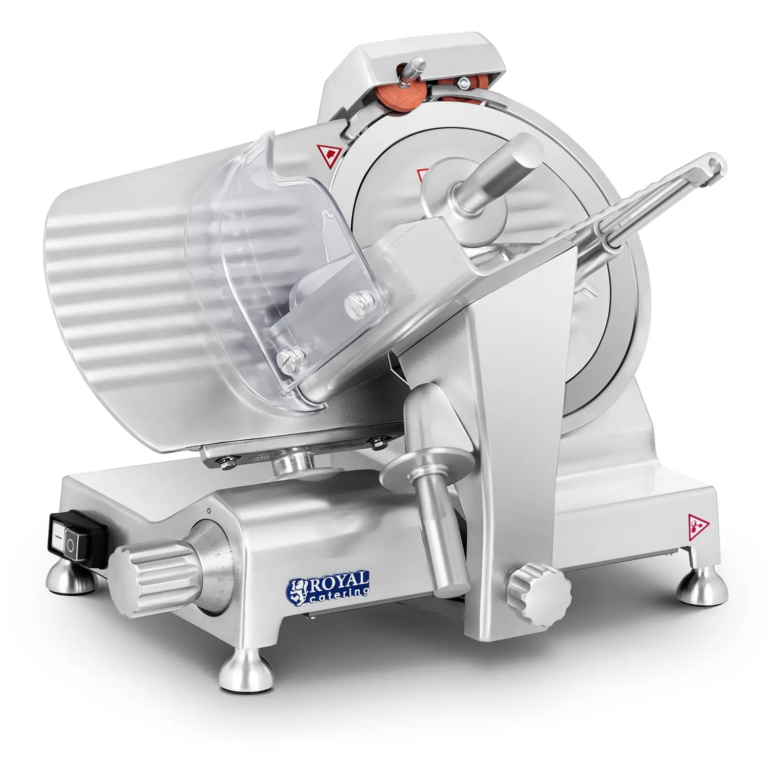 Royal Cateringin Expert-sarjan RCAM 250EXPERT -siivutuskone suunniteltiin ammattimaista käyttöä varten. Siivutuskone on valmistettu korkealaatuisesta, anodisoidusta alumiinista ja kestää hyvin ympäristövaikutuksia. Expert-sarja kehitettiin erityisesti korkeaa vaatimustasoa ajatellen. Laitteen paino takaa sen vakauden. Kaikki kahvat ovat korkealaatuista alumiinia. Leikkuun paksuutta voi säätää portaattomasti välillä 0 – 12 mm. Toisin kuin osa kilpailijoistamme, mainitsemme vain todellisen säätövälin. RCAM250EXPERT -siivutuskoneen leikkuuterä on halkaisijaltaan 25 cm. Halkaisija on ihanteellinen myytävien tuotteiden ammattimaista ja asianmukaista leikkaamista ajatellen. Erikoisterä on kovakromattu, optimaalisesti hiottu ja sileä. Laite toimii tehokkaalla 180 W moottorilla. Laitteen kuori on tehty alumiiniseoksesta, joka soveltuu käytettäväksi lihan ja muiden elintarvikkeiden käsittelyssä. Anonisoidusta alumiinista valmistettu pinta takaa helpon puhdistamisen ja kaikenlaisten elintarvikkeiden vaivattoman käsittelyn. Yksi RCAM 250EXPERT -leikkelekoneen eduista on integroitu puoliautomaattinen teroittaja erikoisteräksestä valmistettuja leikkuuteriä varten. Heti kun terä alkaa tylsyä, voit hyvin helposti käynnistää teroituksen. Teroittaja toimii samalla myös suojamekanismina.