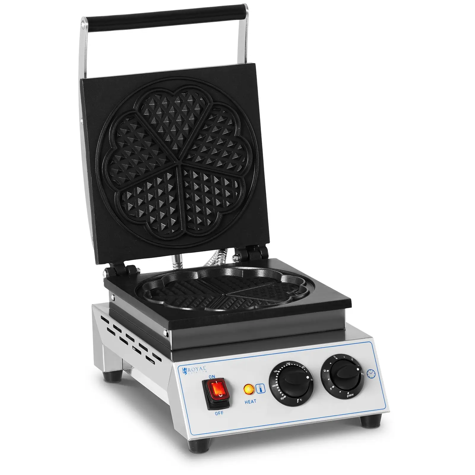 Tuoreet ja rapeat vohvelit, jotka on nopeasti ja helposti tehty! royal_cateringin vohveliraudalla RC-WMR01 saat tuoreiden vohveleiden tuoksun kahvilaasi tai ravintolaasi ja lumoat vieraasi täysin rapealla ja kullanruskealla vohvelilla. Olipa kyseessä sitten makea vohveli suklaalla ja marjoilla tai ruokaisampi versio tuoreilla yrtteillä ja kinkulla – vohvelikoneella tarjoilet herkullisia ja monipuolisia, kooltaan 233 X 233 mm olevia vohveleita käden käänteessä. Kaikki, mitä tarvitset markkinoiden tarpeisiin jokapäiväisessä elämässä ja muualla, löydät royal_cateringin valikoimasta! Vohveliraudassa on kestävä ja pitkäikäinen ruostumattomasta teräksestä valmistettu kotelo sekä teflonpinnoitetusta alumiinista valmistetut paistolevyt ylhäällä ja alhaalla. Molemmat levyt lämmitetään sähköllä 1 500 W:n teholla, ja ne mahdollistavat tehokkaasti yhden suuren tai viiden pienen, paksuudeltaan 11-12 mm olevan vohvelin valmistamisen yhtä paistokertaa kohden vohvelikoneessa. Paistolevyt mahdollistavat vohvelien vaivattoman irrottamisen. Niiden rakenne luo vohveleille kauniin sydämen muodon. Levyjen integroitu ylivuotosuoja estää ylimääräistä taikinaa likastamasta sydämenmuotoista vohvelirautaa ja helpottaa siten puhdistusta. Voit helposti asettaa haluamasi lämpötilan automaattisella termostaatilla, jolloin integroitu automaattinen järjestelmä huolehtii kaikesta muusta puolestasi. Lämpötila on valittavissa 50 – 300 °C väliltä halutusta ruskistusasteesta riippuen. Paistoaika voidaan asettaa ajastintoiminnolla välille 0 – 5 min. Tällöin vohvelien valmistus sujuu aina optimaalisesti. Lämpöeristetty kahva takaa vohvelikoneen turvallisen käsittelyn. Pohjassa on neljä kumitassua, jotka takaavat aina optimaalisen pidon lähes kaikilla säilytyspinnoilla ja suojaavat niitä samalla naarmuilta. Valitse Royal Cateringin vohvelirauta ja lumoa vieraasi rapeilla kulinaarisilla vohveliherkuilla!