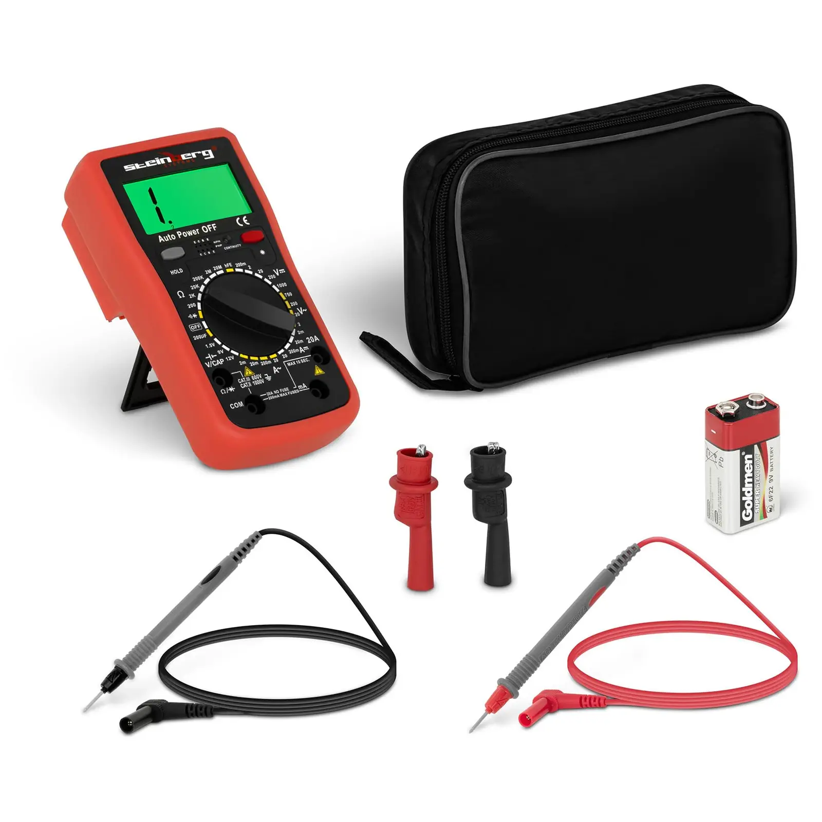 Steinberg Systemsin digitaalinen yleismittari kuuluu elektroniikkatyöpajojen ja sähköasennustöiden perusvarustukseen. Digitaalinen kompakti laite soveltuu jännitteen, virran, resistanssin, kapasiteetin mittaukseen sekä tasa- ja vaihtovirran jännitteen laaja- alaisiin seurantamittauksiin ja transistorin (hFE) testaukseen. Mitta-alueet ovat 200 mV – 1 000 V (DC), 2 V – 750 V (AC), 2 mA – 20 A (DC) ja 200 Ω – 2 MΩ. Kaikki tulokset esitetään laajalla 2 000 luvun näyttöalueella. CAT III luokallaan sitä voidaan käyttää esimerkiksi sähköjohtimien virran mittauksiin – ihanteellinen teollisuuteen, ammattikäyttöön, elektroniikan- ja mekaniikan osa-alueille sekä yksityiskäyttöön. Digitaalinen yleismittari on varustettu lukuisilla ominaisuuksilla, jotka tekevät mittarin käytöstä erityisen mukavaa. LCD-näytön taustavalaistus mahdollistaa reaaliajassa esitettävien arvojen vaivattoman lukemisen myös huonossa valaistuksessa. Hold-data-toiminnolla voit lisäksi jäädyttää mitta-arvot tietyksi ajaksi näytölle. Toimintojen ja mitta-alueen valinta tapahtuu helposti ja nopeasti suurella vääntökytkimellä. Kaikki tarvittavat johdot ja anturit sisältyvät toimitukseen. Pienen kokonsa ja kevyen painonsa ansiosta yleismittari sopii täydellisesti käteen ja paristokäytön ansiosta (6F22, 9 V ei kuulu toimituksen sisältöön) se on ihanteellinen myös liikkuvaan käyttöön. Automaattinen sammutustoiminto takaa paristojen pitkäikäisyyden. Lisäksi näytössä oleva symboli ilmoittaa hyvissä ajoin, kun on paristojen vaihton aika. Kulmasta säädettävä tukivarsi yleismittarin selkäpuolella sekä nailonlaukku säilytykseen mukavoittavat laitteen käyttöä.